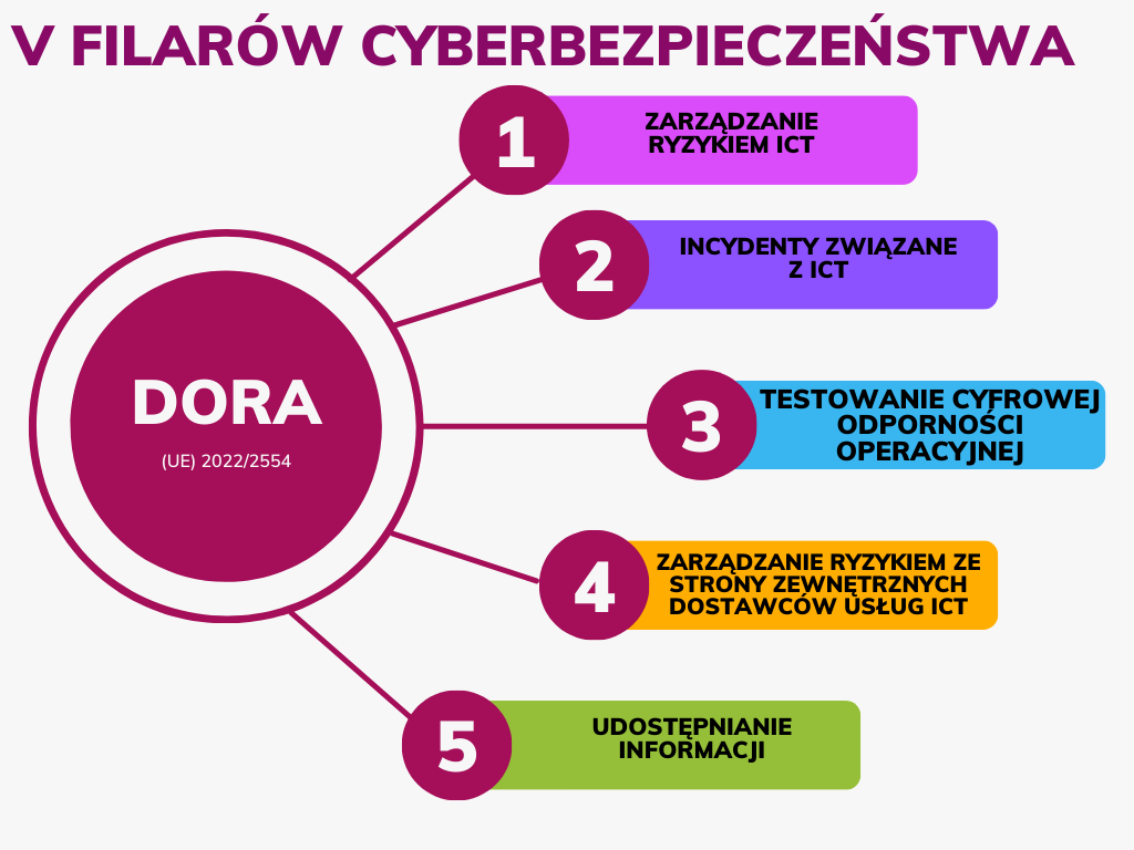 Realizacja założeń Rozporządzenia DORA oparta jest na pięciu kluczowych filarach, które obejmują: